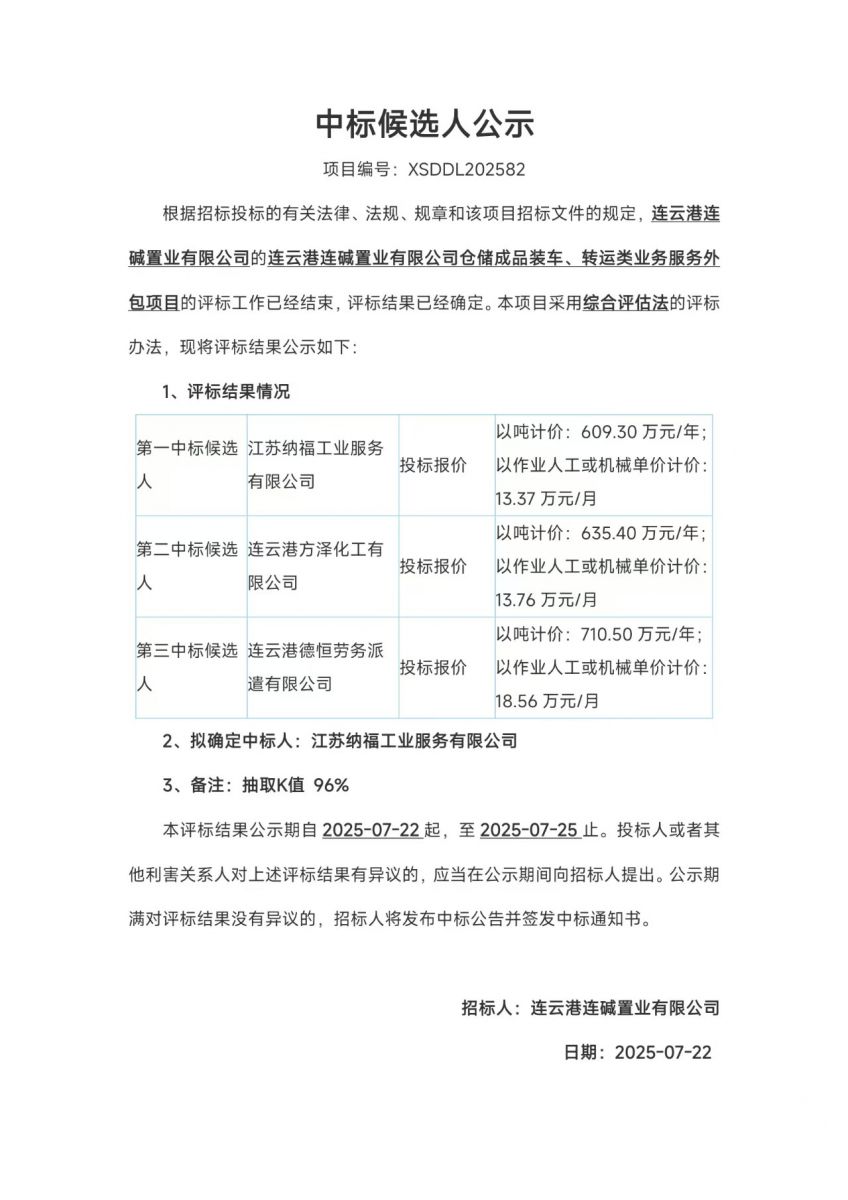 連云港連堿置業有限公司倉儲成品裝車、轉運類業務服務外包項目中標候選人公示
