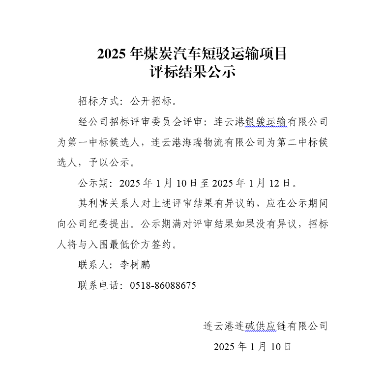 2025年煤炭汽車短駁運輸項目評標結果公示